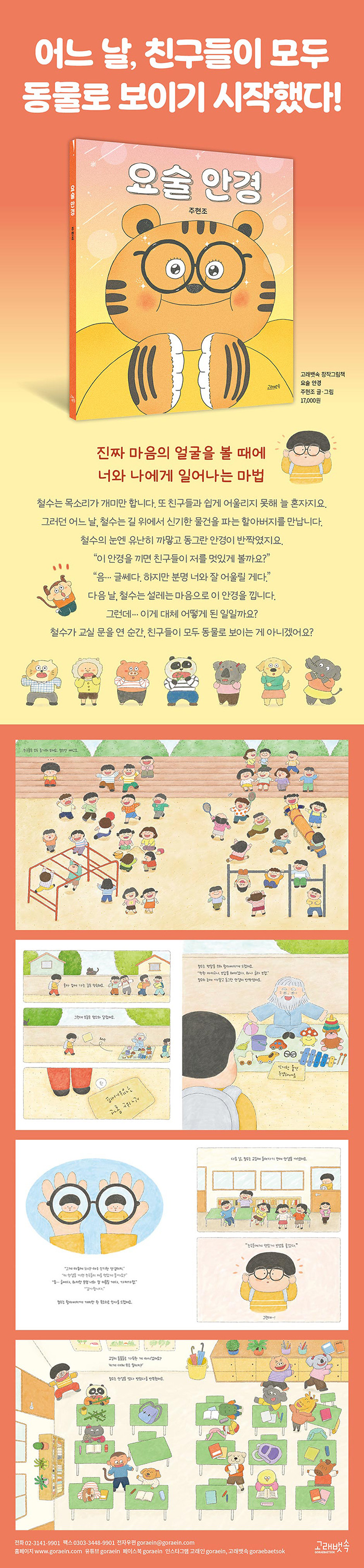 다음 날, 철수는 설레는 마음으로 이 안경을 낍니다. 친구들이 자신을 멋있게 봐 주기를 바라면서요. 그런데… 이게 대체 어떻게 된 일일까요? 철수가 교실 문을 연 순간, 친구들이 모두 동물로 보이는 게 아니겠어요?