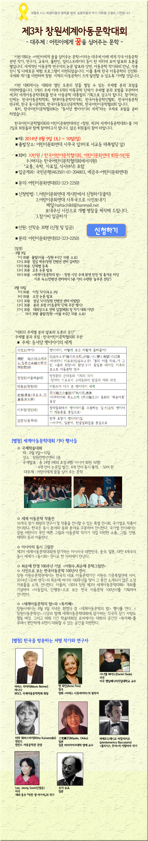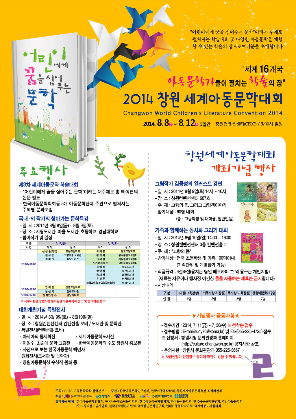 [8월9~10일] 창원세계아동문학대회 -어린이에게 꿈을 심어주는 문학 작성자어린이문화연대|작성시간14.05.27|조회수310 목록 댓글 1 글자크기 작게가 글자크기 크게가 다음검색 현재 게시글 추가 기능 열기 북마크 신고 센터로 신고 댓글 댓글 1 댓글쓰기 답글쓰기 댓글 리스트 작성자어린이문화연대 작성자 본인 여부 작성자 | 작성시간 14.07.01 인원수가 거의 다 채워져 현재 접수창을 닫아놓은 상태입니다. 몇 분 남지 않았으니 신청하시고 싶으신 분께서는 어린이문화연대 사무국 (02-323-2250)으로 직접 연락주시기 바랍니다. 댓글 전체보기