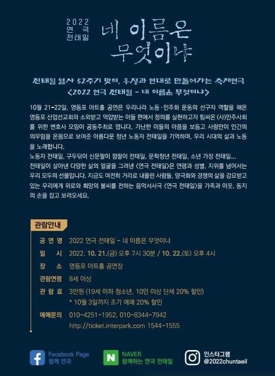 2022 연극전태일은 인터파크에서 티켓 판매가 진행됩니다.