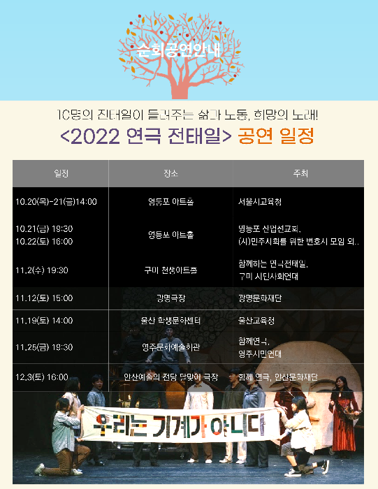 전태일 52주기 맞이, "2022 함께하는 연극 전태일"이 10월 21일 부터 서울 공연을 시작으로 전국 순회 공연을 합니다.