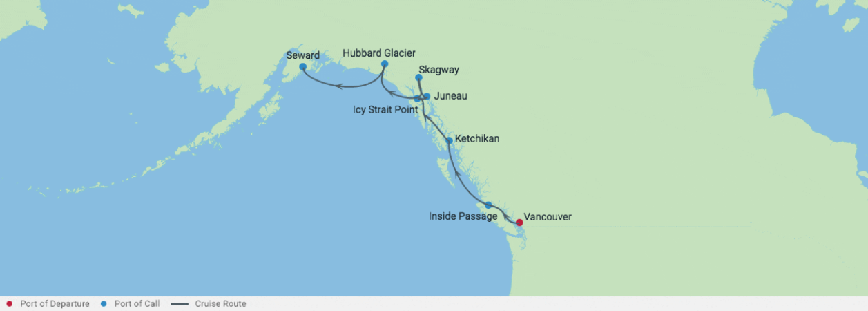 벤쿠버, 캐나 → 인사이드 패시지(항해) → 케치칸, 알래스카 → 아이시 스트레이트 포인트, 알래스카, 미국 → 주노, 알래스카, 미국 → 스캐그웨이, 알래스카, 미국 →