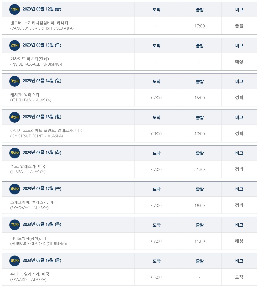 | 방문지역 | 인천 - 벤쿠버 - 케치칸 - 아이시 스트레이트 포인트 - 주노 - 스캐그웨이 - 수어드 - 앵커리지 |