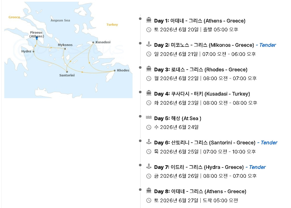 | [26년 6월 19일 출발확정!!] 동부지중해 크루즈 10일 (#그리스/아테네,로데스,산토리니,히드라,미코노스 #터키/쿠사다시) |