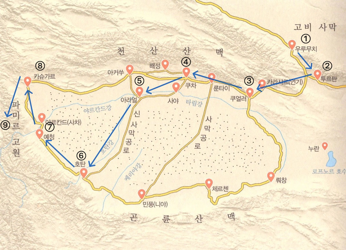 | 방문지역 인천 - 우루무치 - 투루판 - 쿠얼러 - 쿠차 - 아라얼 - 호탄 - 카슈가르 - 카라쿨호수(파미르고원) - 인천 [중국항공] |