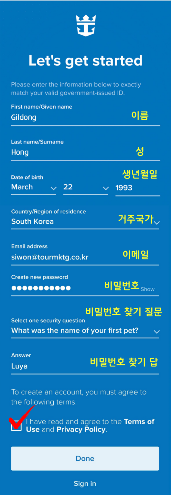 1. 로얄캐리비안크루즈 영문홈페이지(https://www.royalcaribbean.com/account/create) 에 접속하여