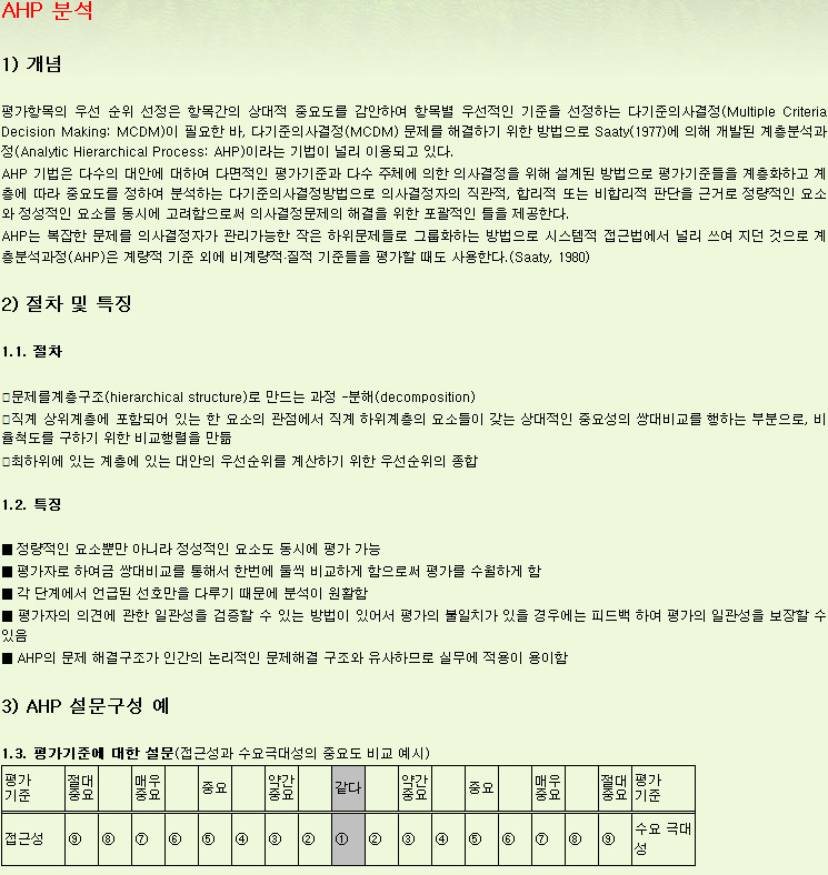 계층 분석법-AHP(Analytic Hierarchy Process)분석 개념, 절차 및 특징 작성자guodong|작성시간11.11.07|조회수771 목록 댓글 0 글자크기 작게가 글자크기 크게가 AHP 기법을 이용한 패스트푸드점의 경쟁력 평.pdf AHP를 이용한 기업의 사회공헌활동 우선순위 .pdf AHP를 이용한 정보시스템 개발업체 선정에 관.pdf AHP를 이용한 프랜차이즈 커피전문점 선택속.pdf AHP를 이용한 항만 리모델링 비시장적 편익요.pdf BSC 및 AHP를 활용한 기획여행상품 등급화 지.pdf 첨부파일첨부된 파일이 8개 있습니다. jpg 파일 1.jpg 다운로드 jpg 파일 3.jpg 다운로드 pdf 파일 AHP 기법을 이용한 패스트푸드점의 경쟁력 평.pdf 다운로드 pdf 파일 AHP를 이용한 기업의 사회공헌활동 우선순위 .pdf 다운로드 pdf 파일 AHP를 이용한 정보시스템 개발업체 선정에 관.pdf 다운로드 pdf 파일 AHP를 이용한 프랜차이즈 커피전문점 선택속.pdf 다운로드 pdf 파일 AHP를 이용한 항만 리모델링 비시장적 편익요.pdf 다운로드 pdf 파일 BSC 및 AHP를 활용한 기획여행상품 등급화 지.pdf 다운로드 다음검색 현재 게시글 추가 기능 열기 북마크 공유하기 신고 센터로 신고 댓글 댓글 0 댓글쓰기 답글쓰기 댓글 리스트
