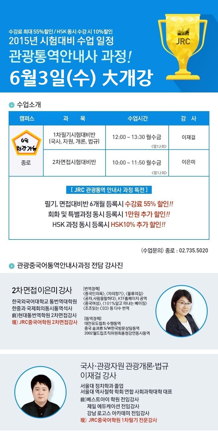 ▶JRC중국어학원◀ 2015년 하반기 관광통역 안내사 시험대비과정 대개강! 작성자중국어스터디|작성시간15.05.21|조회수17 목록 댓글 0 글자크기 작게가 글자크기 크게가 다음검색 현재 게시글 추가 기능 열기 북마크 공유하기 신고 센터로 신고 댓글 댓글 0 댓글쓰기 답글쓰기 댓글 리스트