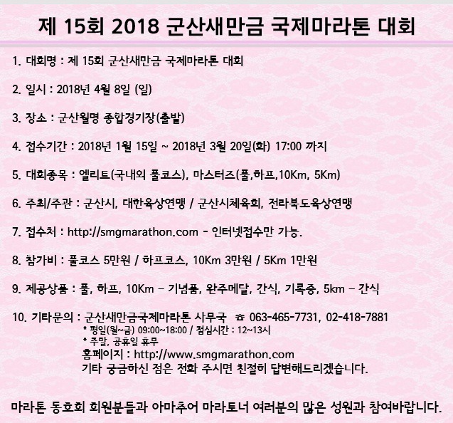 2018 군산새만금국제마라톤대회 작성자rlaskarb|작성시간18.01.30|조회수8 목록 댓글 0 글자크기 작게가 글자크기 크게가 다음검색 현재 게시글 추가 기능 열기 북마크 공유하기 신고 센터로 신고 댓글 댓글 0 댓글쓰기 답글쓰기 댓글 리스트