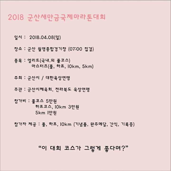 -대회종목 : 엘리트(국내,외 풀코스), 마스터즈(풀, 하프, 10km, 5km)