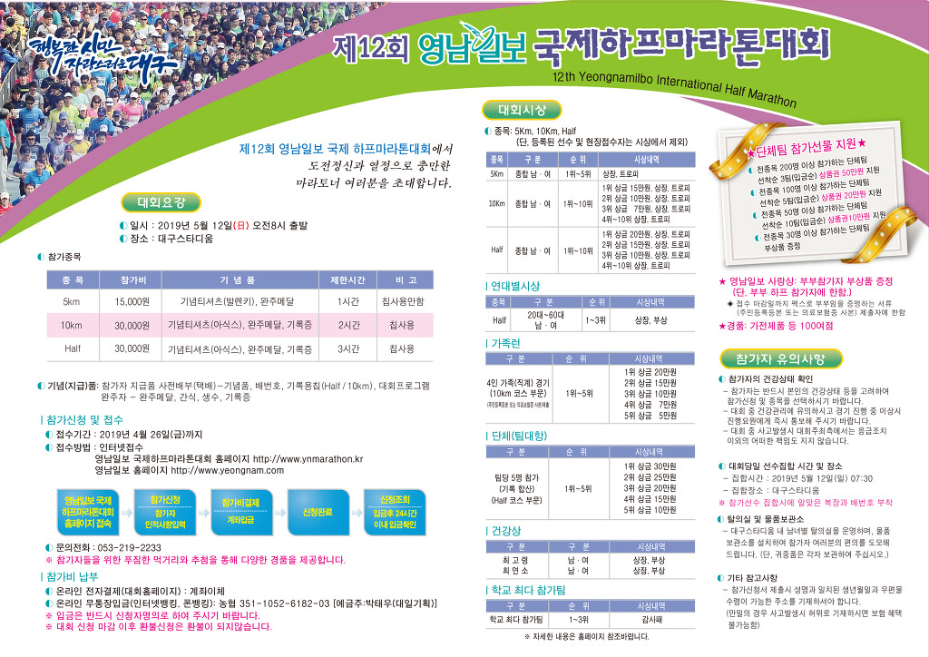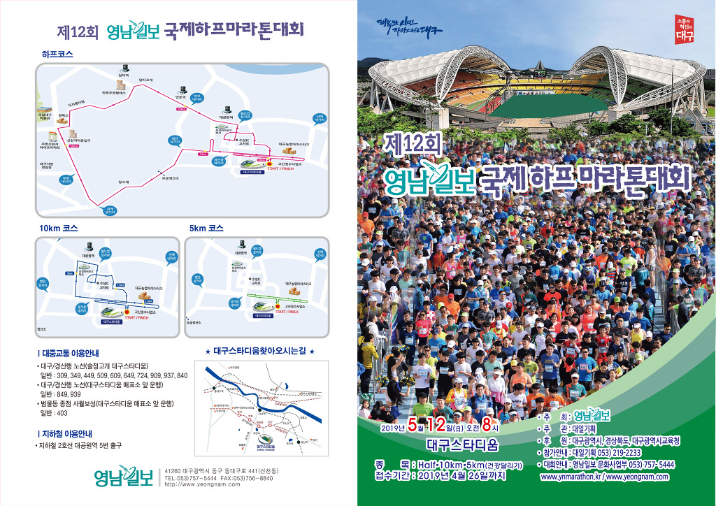 제12회 영남일보 국제하프마라톤대회 5월12일(일) 대구스타디움 작성자영남일보|작성시간19.03.25|조회수28 목록 댓글 0 글자크기 작게가 글자크기 크게가 다음검색 현재 게시글 추가 기능 열기 북마크 공유하기 신고 센터로 신고 댓글 댓글 0 댓글쓰기 답글쓰기 댓글 리스트