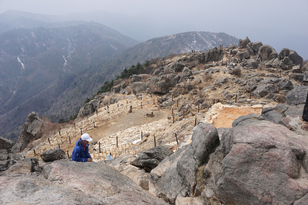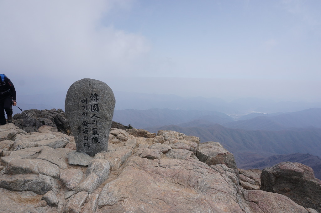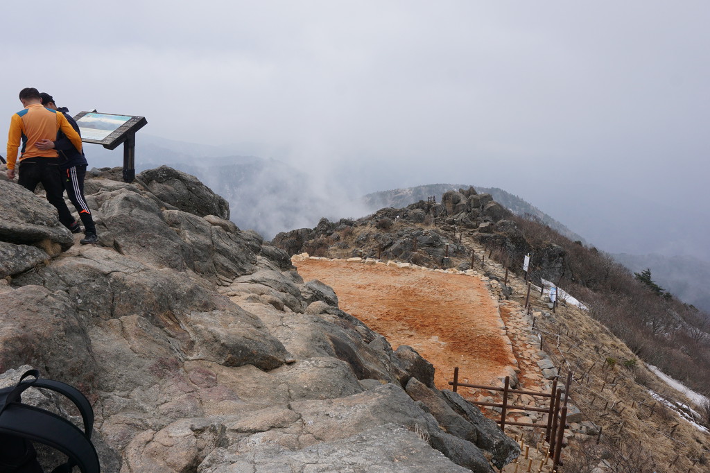 미세먼지인지 황사인지 뿌연 연무가 시야를 아주 흐리게 하여 장엄한 지리 능선을 못보게 하니.... 정상 주변에 황토는 왜 깔려는지?...