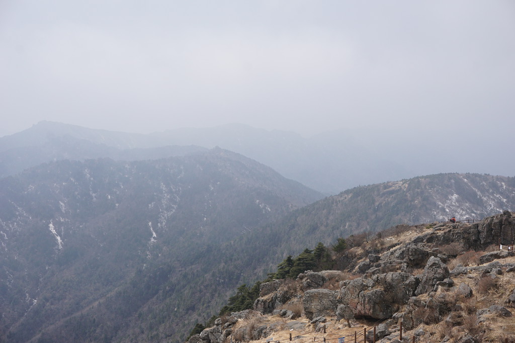 연무가 흐려 중청이 희미하고 가는 길은 대문으로 막아 보호하려는 듯.