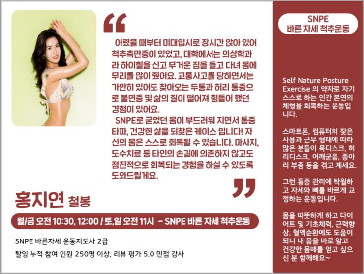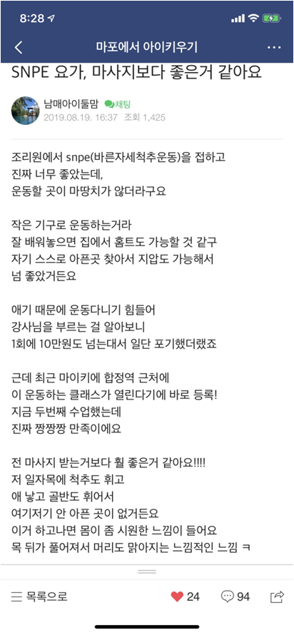 19년 7-9월 GX 스튜디오에 줌바 선생님께서 본인이 엄청 좋은 운동을 알게 됐다며 원장님도 이거 해보라며 SNPE를 알려주셨습니다. 진짜 아무리 생각해봐도 진짜 운명같았습니다. 1번 동작을 해보라며 알려주셨는데 뭔가 느낌이 왔습니다. 바로 인터넷검색을 해서 SNPE에 대해 더 알아보았고, 우리 센터에수업으로 당장 넣어야 겠다는 생각에 선생님을 알아보았습니다. SNS를 통해 몇 분 선생님을 컨텍했는데홍지연 선생님을 운명처럼 만났습니다. 선생님도 교통사고를 엉덩이로 떨어져서 다치셨고, 그 과정에서 필라테스나 도수치료 같은 많은 방법을 썼지만 통증을 고치지 못하셔서 SNPE를 하게 됐다고 하셨습니다. SNPE만큼은 센터 비즈니스를떠나서 제가 운동치료를 해야겠다는 생각이었기 때문에 순수한 마음으로 지역 맘카페에 올려서 같이 수업을 들으실 분들을 모집했습니다. 댓글이 20-30개가 달려서 지금 애기 때문에 못듣지만 나중에 꼭듣고 싶다는 엄마들이 정말 많았습니다. 그렇게 시작된 SNPE 수업은우리 센터에 가장 인기 클래스가 되었습니다. 수업을 들은 엄마들이 자발적으로 맘카페에 후기를 남겨주었습니다.