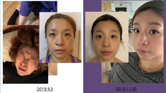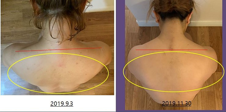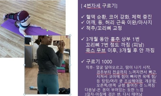 -앞이마쪽에 머리가 새로 나고, 등에 여드름이 사라지고, 무게 중심선이 2/3지점 뒤로 가지고, 몸은 통통한데 비해 너무 빈약했던 엉덩이에도 드디어 근육이 붙어 힙업이 되고,맨날 힘을 허벅지 바깥쪽 벌림근을 썼는데 허벅지 안쪽, 뒤쪽힘을 쓰니 코어도 더 강화되고자세도 균형이 맞춰지고 종아리 앞쪽도 안아프고, 힙조인트 부분에서 나던 끄덕끄덕 소리가 없어지고, 스트레칭을 하면 다라락~ 하는 경쾌한 뼈 맞춰지는 소리가 들리고, 걸을때 무(릎)스(치고)다(리)스(치고)해서 습관이 되고평상시에 운동이 되고, 조금만 어깨가 뻐근하면 장소 가리지 않고 1번동작(화장실에서도 할 수 있음) 하면 훨씬 몸이 개운해지고, 7번정도 까져서 피를 흘렸던 꼬리뼈가 구르기 1000번을 해도 이제안까지고, 콕스무브 너무 시원해서 중독되었는데 남편이 안해줘서 삐칠 지경이고…너무 많아서ㅋㅋㅋ