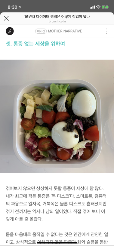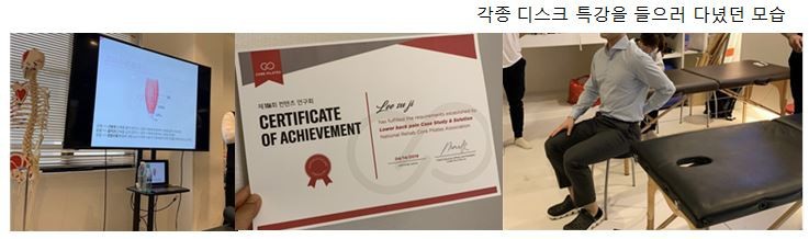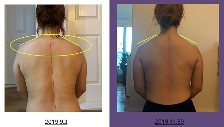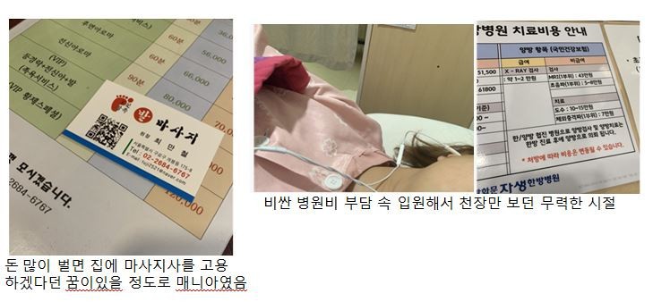 19년 5월 디스크로 쓰러지기 몇일 전부터 어깨가 너무 무겁고 뻐근한 통증이 있었습니다.PT 선생님께 증상을 얘기해서 어깨, 등 부위를 공략한 동작들을 많이 넣어 운동을 시켜주셨습니다. 근데 그게 오히려 더 화근이 되어 견갑골 조이는 동작을 넣은 스쿼트를 많이 했던 그 날 저녁에 갑자기 쓰러졌습니다. 숨이 안쉬어지고 통증 강도가 출산했을때와 맘먹거나 그 이상일 정도로 견디기가 어려워서 누워서 마구 소리를 질렀습니다. 남편에게 부탁해서 PT 선생님께 연락해달라고 했는데 병원에 가라고하셔서 남편이 아무리 마사지를 해줘도 통증이 너무 극심해져서 결국 119를 불렀습니다. 진짜 이 정도면 죽을 수도 있겠구나 생각했습니다. 19년 6월 119에 실려 밤 12시가 조금 안된 시간에 신촌연세병원에 갔고 엑스레이를 찍었습니다. 일자목은 워낙 오래된 것이었고,등이 굽었다고 했습니다. 주사를 맞고 일단 퇴원하되 외래 진료를 오라고 했습니다. 다음날 광화문 자생한방병원에 갔고 MRI 촬영을 하였고 입원하라고했습니다. 하루에 2번씩 도수치료, 추나요법, 침치료, 물리치료, 약복용을 하였습니다. 4일을 그렇게 누워있는데도 나아질 기미는 안보이고일주일정도 더 입원을 하라는데 병원비가 300만원 정도였습니다. 너무부담이 큰데 몸은 너무 개선의 여지가 없고 답답해서 퇴원하겠다고 했습니다. 퇴원해서 주변에 디스크 지인들에게물어물어 각종 디스크 치료법을 알아보았습니다. 도수치료와 주사요법을 많이 추천받았는데 이미 받아봐도이건 답이 아닌 것 같아서 다른 방법을 시도해봅니다. 오랫동안 자가 수련을 하신 친척분이 집으로 오셔서마사지와 운동법을 알려주시기도 하고 소개받은 마사지 샵에서 병원에서 물리치료 하셨었다는 원장님께 마사지를 1번에 10만원씩 5회 정도 받았습니다. 인도우붓치료법을 배우신 또 나름 유명한 분도 소개받아서 역시 1번에 6만원씩 10번 정도를 받았습니다. 그 기간에 대상포진까지 같이 와서 비타민주사, 영양제를 몸에 때려 넣으며 지냈습니다. 그렇게 2달을 창업한 스튜디오는 방치한 채 여러곳에 돈을 뿌리며 통증을 해결하려고 방황하고 다니며 살았습니다.