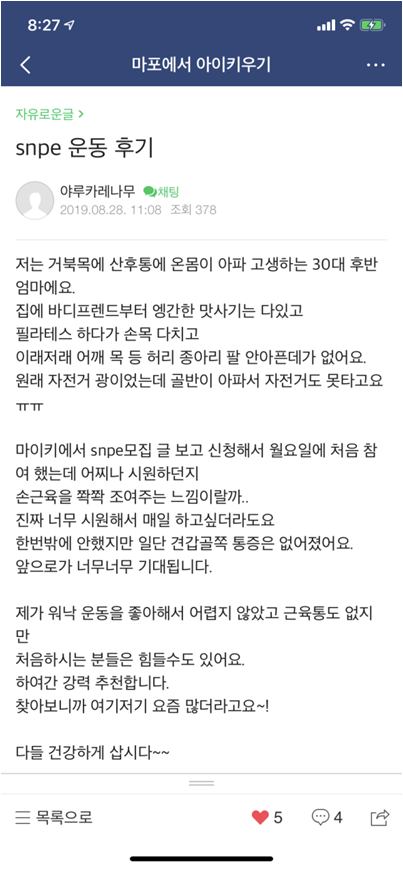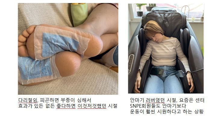 · 통증 원인 : 목디스크, 허리디스크· 병명/수술여부 : 없음· 처음 SNPE하게 된 계기 : 목디스크로 입원해서 알아보던 중 지인 소개· 운동 참여 기간 : 5개월