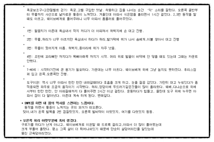 · 병명/수술여부 : -· 처음 SNPE하게 된 계기 : 인터넷 검색으로 알게되어· 운동 참여 기간 : 1년9개월