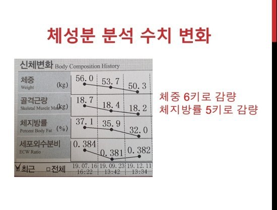 6.외적인 변화로는 체지방률이 5키로 감소한 것이다.