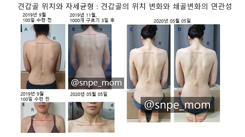 저는 SNPE 4번 동작 구르기를 하면서, 또한 SNPE T무브를 하면서 ~ 등모양, 흉추, 견갑골의 위치에 대해서 관심 있게 지켜보고 있습니다. 또 견갑골의 위치와 쇄골 라인도 밀접한 관계가 있음을 견갑골을 모으고 목을 들고 하는 1번 동작을 하면서 그 움직임에 집중하고 있습니다. 그래서 제가 2019년 SNPE 지도사 과정을 시작했을때 사진과 최근의 모습 등 사진을 비교해 보겠습니다.