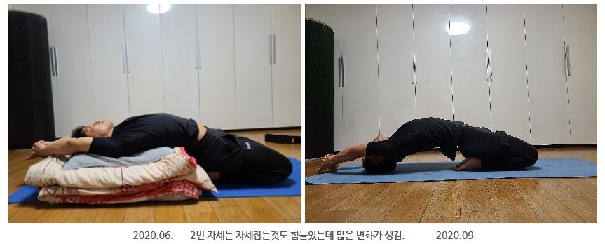 20대 때부터 제가 요통이 있다는 것과 MRI를 찍고 척추분리증이 있다는 것을 알고 계셨기에 제게 평생 할 아주 좋은 운동이라고 권해주셨습니다. 대부분 동작을 배웠지만 모든 동작을 꾸준히 반복하지는 못했습니다. 강습이 끝나고 나무 다나손과 웨이브 베게로 등과 허리부분과 이상근 부분을 풀어주며 작은 통증들을 다스렸습니다.