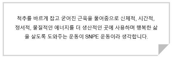 무지로 인해 순리로 여기는(병원에서 의사 선생님이 그렇게 말하니까. 전문가가가 말하니까. 많은 사람들이 그렇게 하니까)것을 SNPE운동을 배워 내몸을 이해하고 통증을 감소시켜 건강하게 즐겁게 살 수 있음을 확신하게 되었습니다.