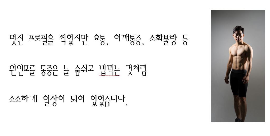 2019년 초 제가 좋아하는 운동을하고 헬스를 배워 40대 인생에서 남길만한 프로필도 찍을 수 있었습니다. 개인 PT를 하면서 왼쪽으로 몸이 기울어서 복근이 사선이 되었다는 이야기를 듣고 처음으로 제 몸이 틀어졌다는 것을 알게 되었습니다.