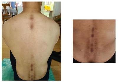 구르기를 할 때 요추가 굳어져 있어 녹슨 자전거체인처럼 부드럽게 구르지 못할뿐 아니라 통증이 있다는 것을 알았습니다. 요추 3번이 안쪽으로 굳어져 있어 자국이 나타나지 않고 다른 부위들이 튀어나와 피부가 검게 변색이 되었습니다.