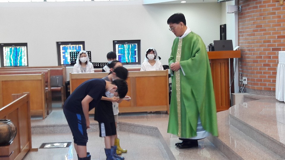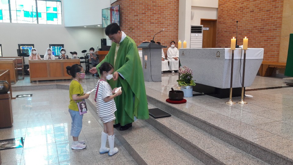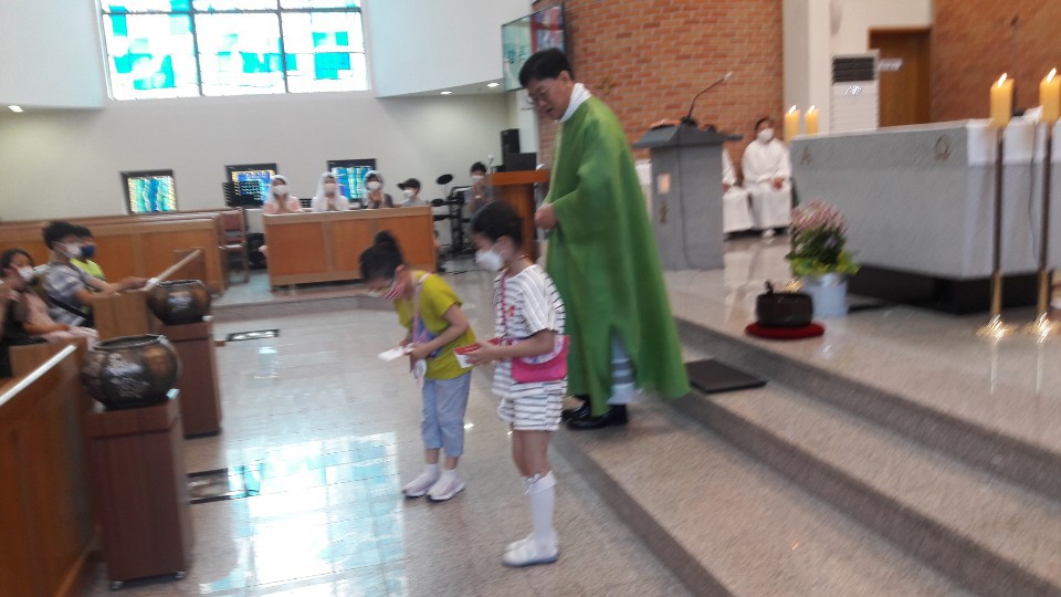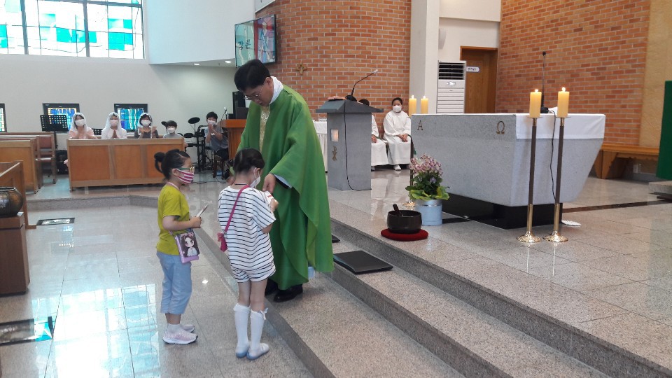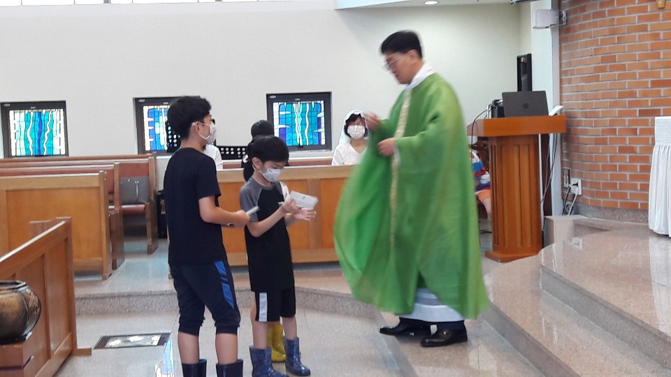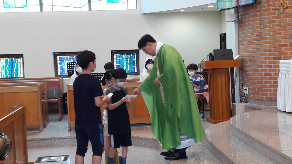 어린이 주보 '무지개 ' 의 " 예수님 말씀 잘 들었어요!" 퀴즈에 응모하여 정답자들은 본당신부님께서 어린이 미사중에 선물을 주셨습니다.