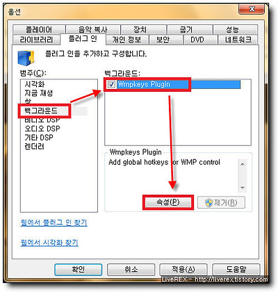 ▼ 옵션 메뉴를 선택한 후 [플러그인]탭으로 이동합니다. 그리고는 백그라운드 범주를 선택, Wmpkeys Plugin 항목을 체크하면 단축키 관련 플러그인이 활성화 됩니다. 이제 원하는 단축키를 설정하시면 되는데 그 방법은...