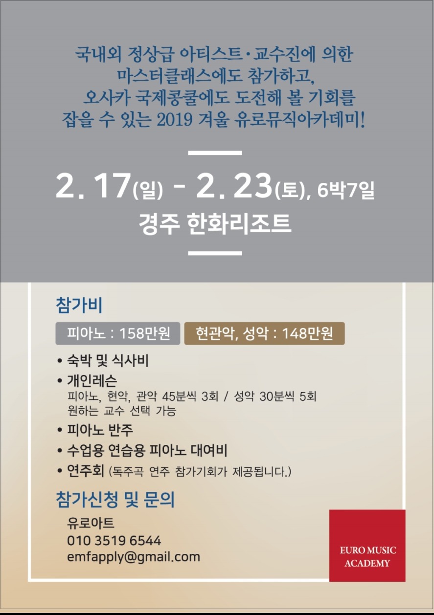 [2019. 2] 국내외정상급 교수진 아티스트들에 의한 마스터클래스 참가하실 분 환영합니다.!| 작성자유로뮤직페스티발|작성시간19.01.08|조회수11 목록 댓글 0 글자크기 작게가 글자크기 크게가 2019 경주 유로뮤직아카데미 보다 자세한 내용은 아래를 클릭하면 볼 수 있습니다. : http://euromusicacademy.blogspot.com/ 다음검색 현재 게시글 추가 기능 열기 북마크 공유하기 신고 센터로 신고 댓글 댓글 0 댓글쓰기 답글쓰기 댓글 리스트