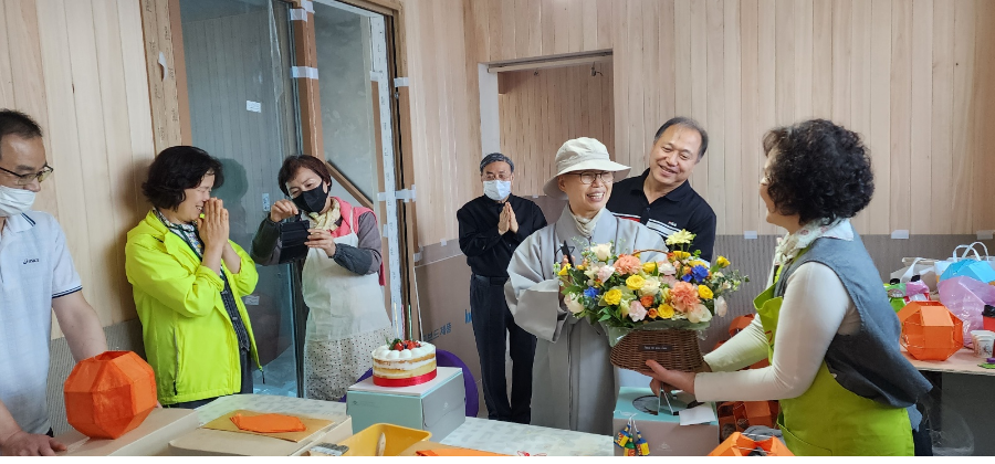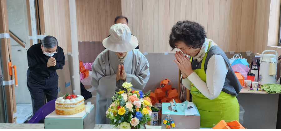 등작업으로 어수선한 가운데 잠시 일손을 멈추고 원장스님께 감사인사를 올렸습니다.