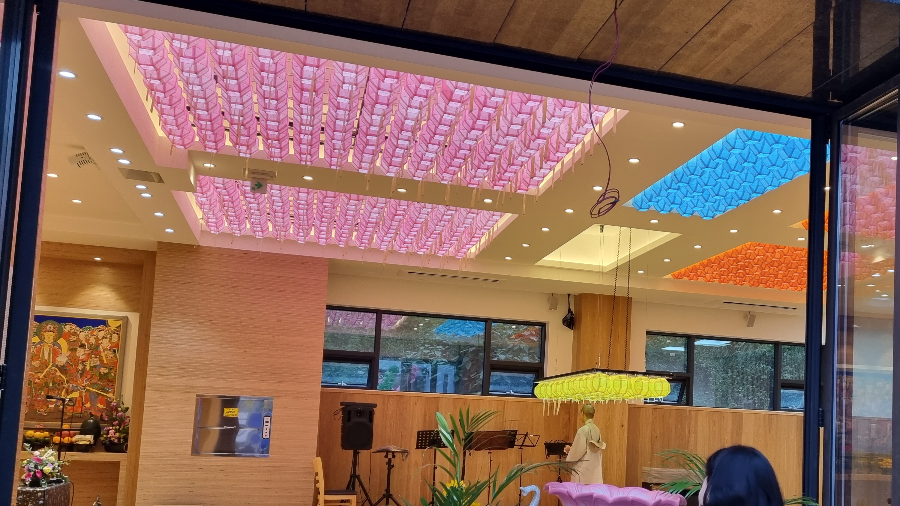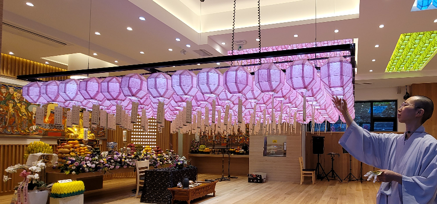 리모컨만 누르면 연등 승강기가 높이 있던 등을 아래로 내려주나 봅니다. 아주 선진화된 법당이지요.