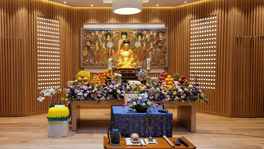 공양상과 꽃장식, 금구가 적힌 초와 연꽃 복전함. 법단커버와 미니종, 미리 준비된 마이크,, 잘 닦아놓았을 원목마루까지