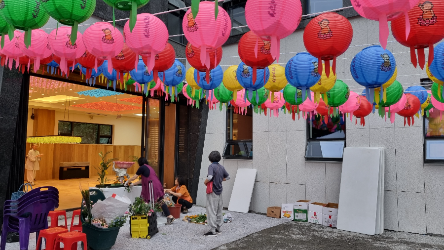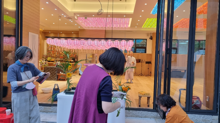법당 밖에선 관불대를 장식하고 계시네요