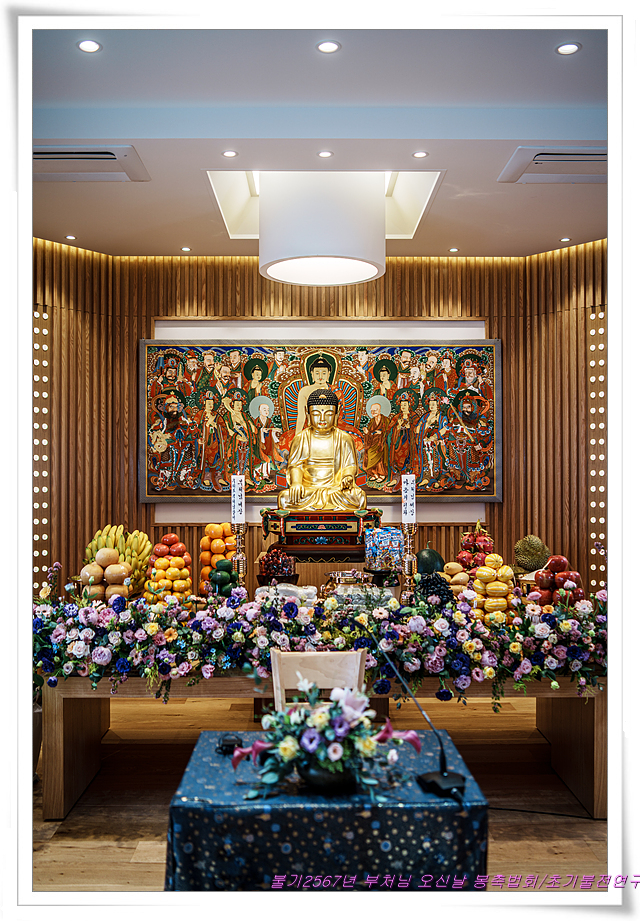갖가지 꽃과 과일로 정성껏 장엄된 불단,