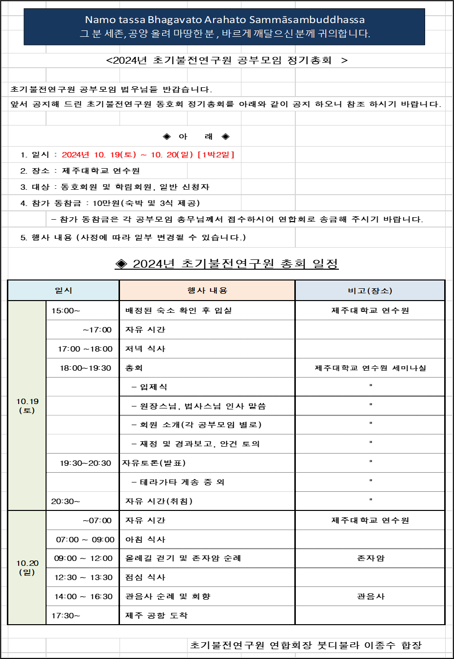 2024년 초기불전연구원 정기총회 안내 작성자붓디물라|작성시간24.09.25|조회수196 목록 댓글 3 글자크기 작게가 글자크기 크게가 2024년 초기불전연구원 정기총회를 아래와 같이 공지합니다.올해 총회에서는 수계법회가 취소 되었으니 참조하시기 바랍니다.* 제주대학교 연수원 주소 : 제주특별자치도 서귀포시 보목로 64본길 117 다음검색 현재 게시글 추가 기능 열기 북마크 공유하기 신고 센터로 신고 댓글 댓글 3 댓글쓰기 답글쓰기 댓글 리스트 작성자patthana | 작성시간 24.09.26 참석합니다 작성자밧디야 | 작성시간 24.09.26 사두 사두 사두_()_ _()_ _()_ 작성자빤냐와띠 | 작성시간 24.10.06 총회에서 뵙겠습니다~.^^사두 사두 사두_()_ _()_ _()_ 댓글 전체보기