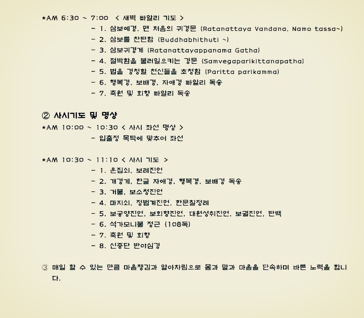 ③ 매일 할 수 있는 만큼 마음챙김과 알아차림으로 몸과 말과 마음을 단속하며 바른 노력을 합니다.