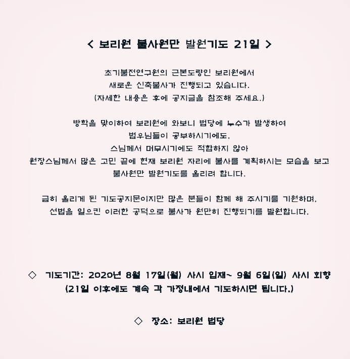 ◇ 기도기간: 2020년 8월 17일 (월) 사시 입재~ 9월 6일(일) 사시 회향