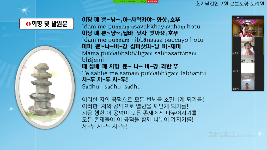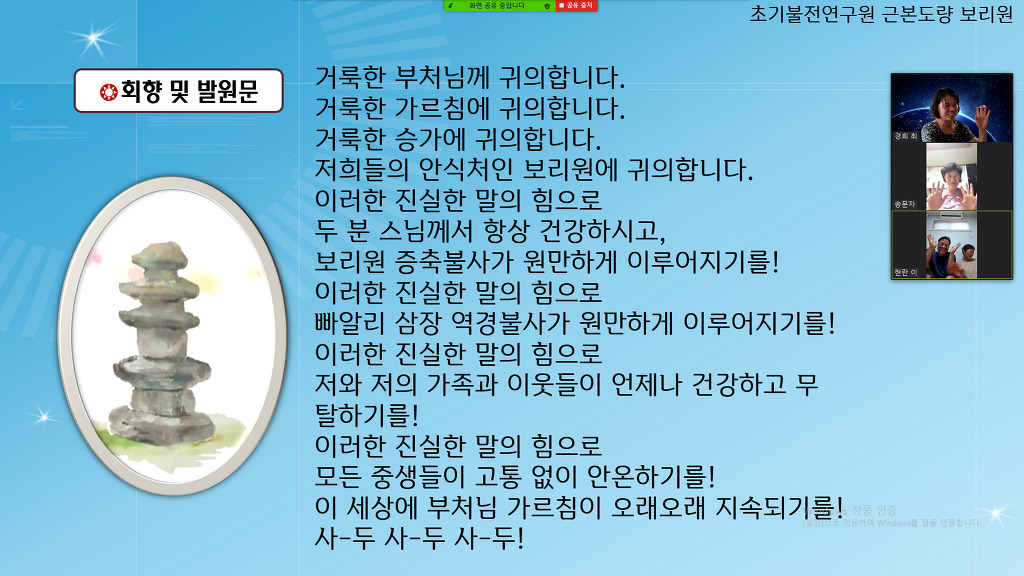 보리원에서 회향 할 계획이었으나 코로나 재확산으로 온라인으로 회향하였습니다.