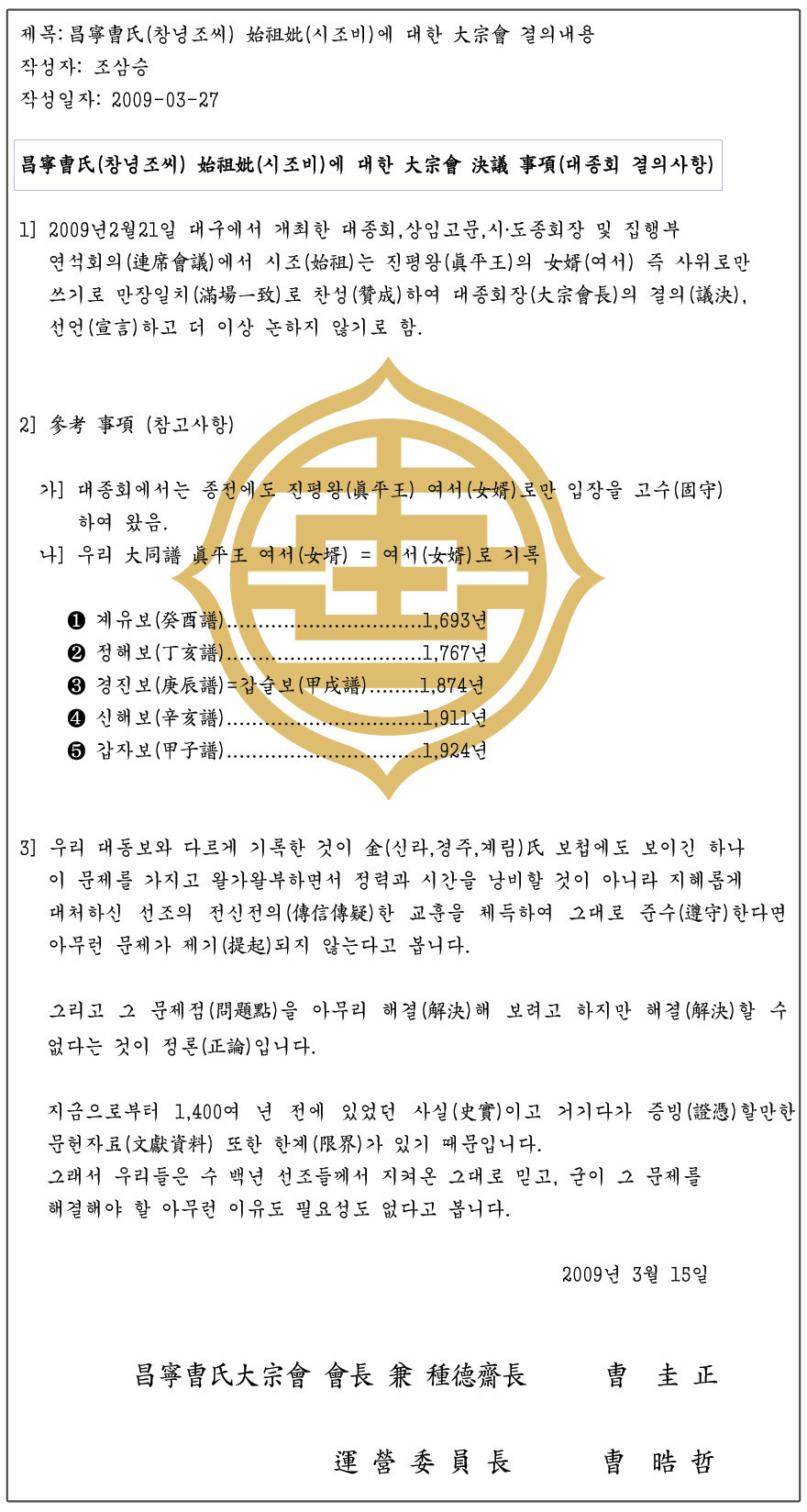 창녕조씨 시조비에 대한 대종회 결의내용-2009. 3. 27 작성자백초(柱煥)|작성시간17.07.27|조회수726 목록 댓글 0 글자크기 작게가 글자크기 크게가 다음검색 현재 게시글 추가 기능 열기 북마크 공유하기 신고 센터로 신고 댓글 댓글 0 댓글쓰기 답글쓰기 댓글 리스트