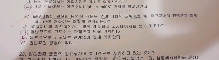 정답은 다 인데요 제가 궁금한건 온대지방이 원산인 단일성 작물이면 따뜻한데서 잘자라던 식물일거라 생각하고 열대지방에서 재배하면 더 따뜻하니까 개화가 빨라질거라고 생각햇는데. 오히려 늦어지네요.