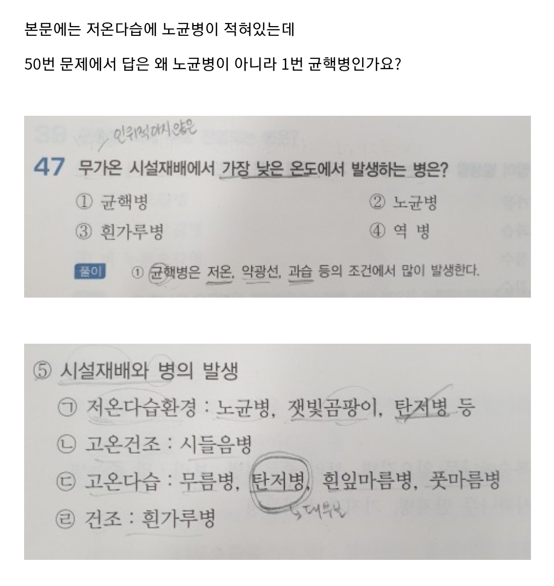 작성자포테이토러버 작성시간 20.12.25 균핵병 발생 조건은 10도~15도, 노균병은 15도~20도라서 가장 낮은 온도에서 발생하는 병을 물어보면 균핵병이 맞습니다.