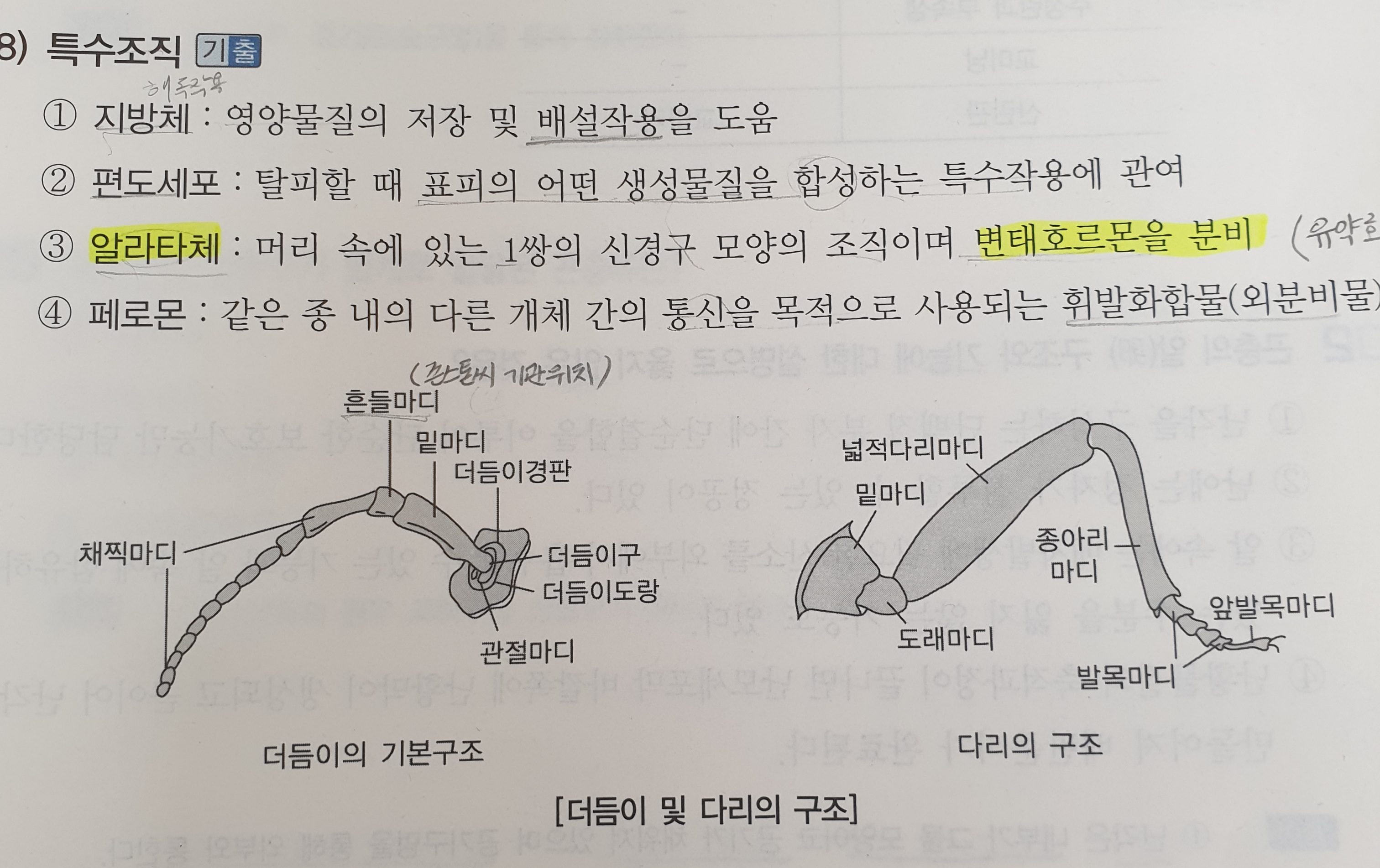 곤충의 유약호르몬은 알라타체에서 분비되는데, 유약호르몬은 탈피억제, 생식관여 기능을 합니다. 본문 책 내용으로 말하면 변태를 억제하는 변태호르몬을 분비하는 곳이 알라타체인거에요! 따라서 알라타체에서 곤충의 변태를 억제하는 구실을 한다, 변태호르몬을 분비한다 둘 다 맞는 얘기입니다. -