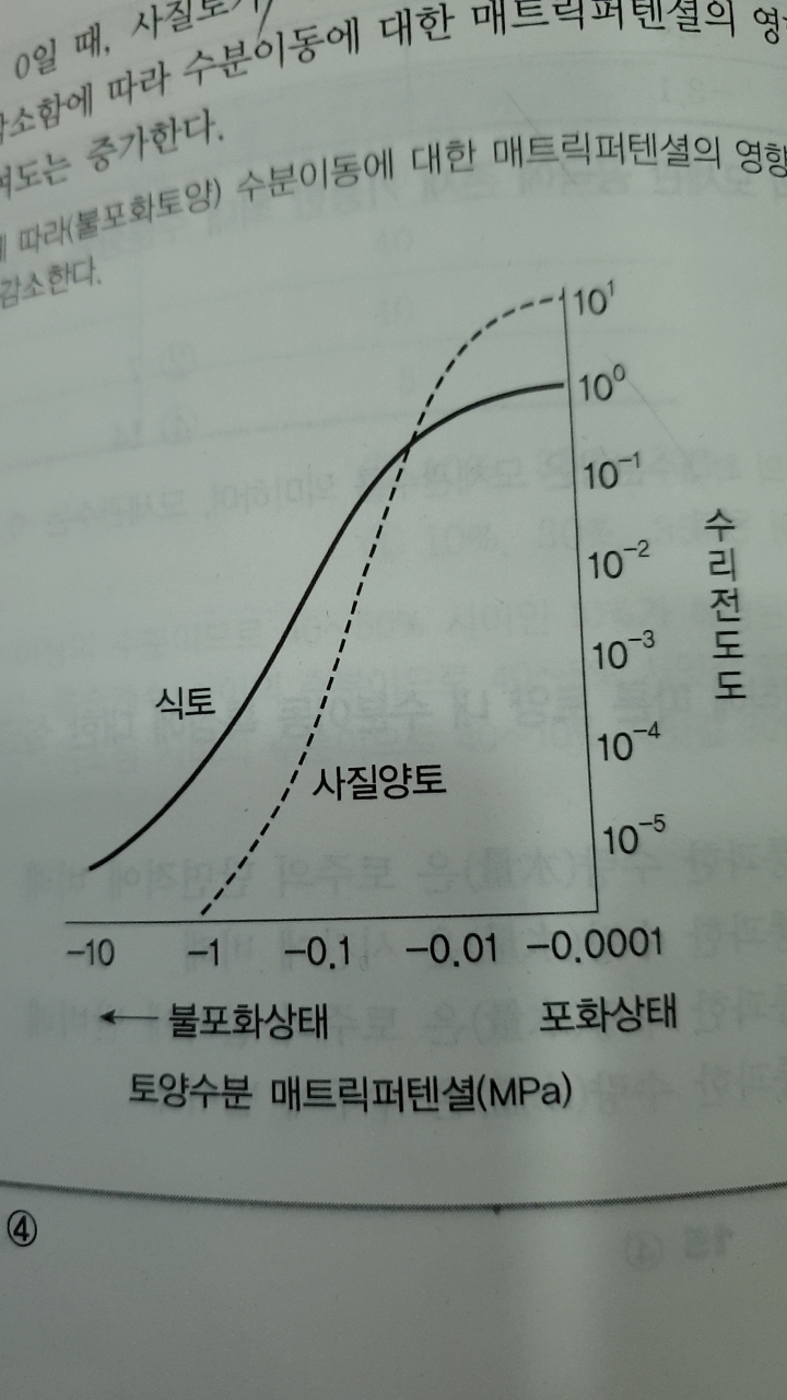 즉, 같은 불포화상태이지만 어느 정도 이상으로 수분 함량이 높을 때는 큰 공극을 통해 물이 이동하므로 큰 공극이 많은 사질계통의 토양에서 수리전도도가 식토보다 큰 것입니다. -