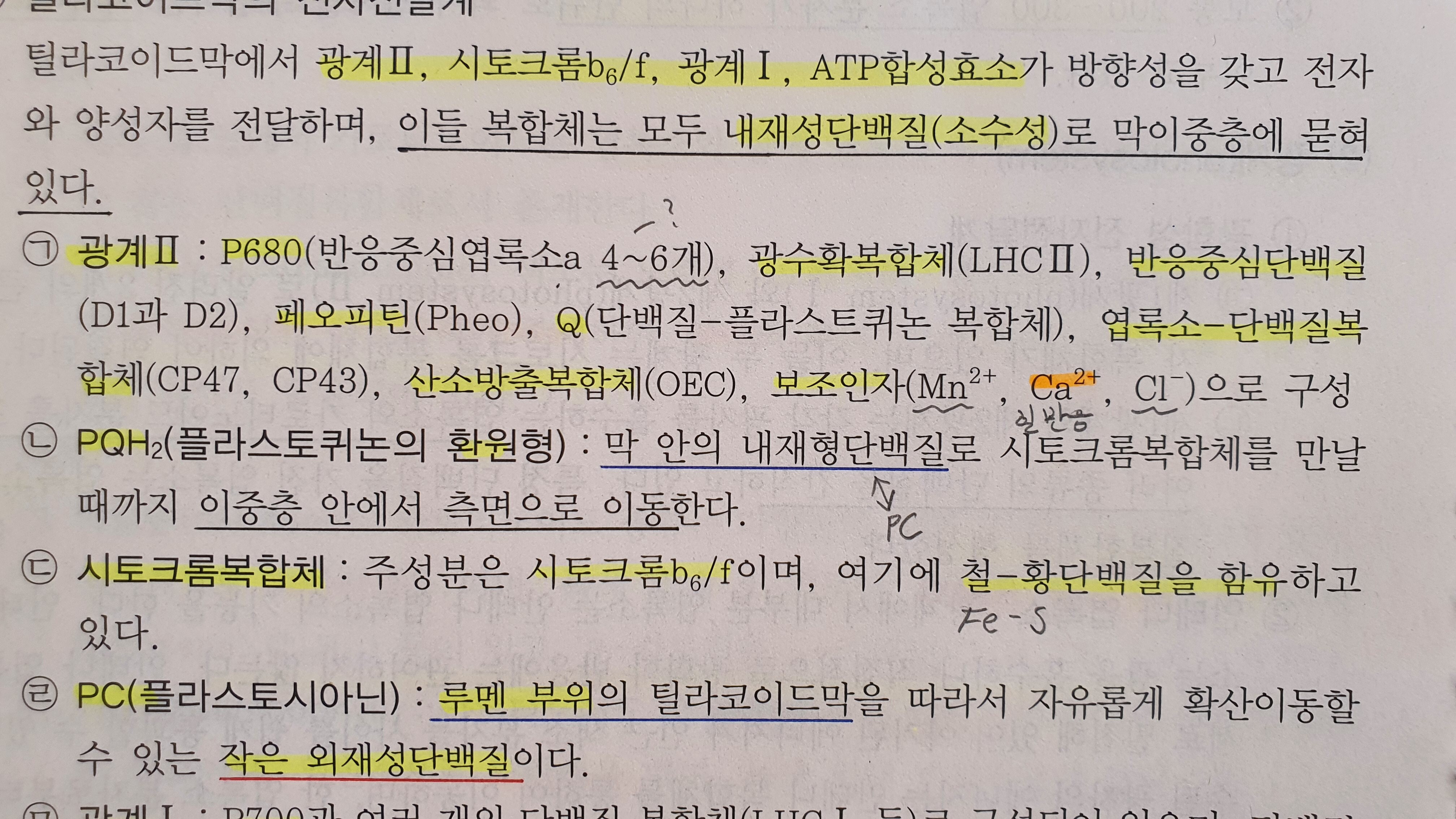 20년도에 추가된 내용인데 여기에는 광계2의 반응중심엽록소a의 개수가 4개에서 6개라고 하는데 원래 광계1 광계2 모두 하나의 엽록소a가 반응중심엽록소가 아닌가요??