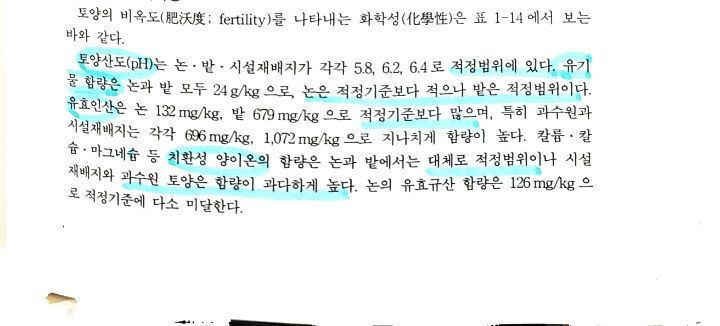 1번 사진 : 논토양은 적정기준보다 유기물이 적고 밭은 적정기준이다