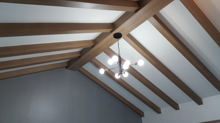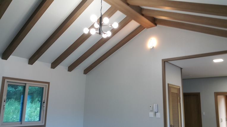 거실 천장은 대들보 인테리어는 한옥 분위기를 연출합니다