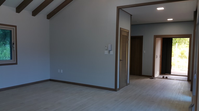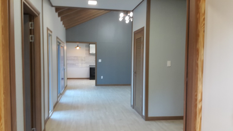 현관문을 들어서니 좌우측으로 방이 2개 있고 거실을 지나 주방이 별도 공간으로 구비되었습니다