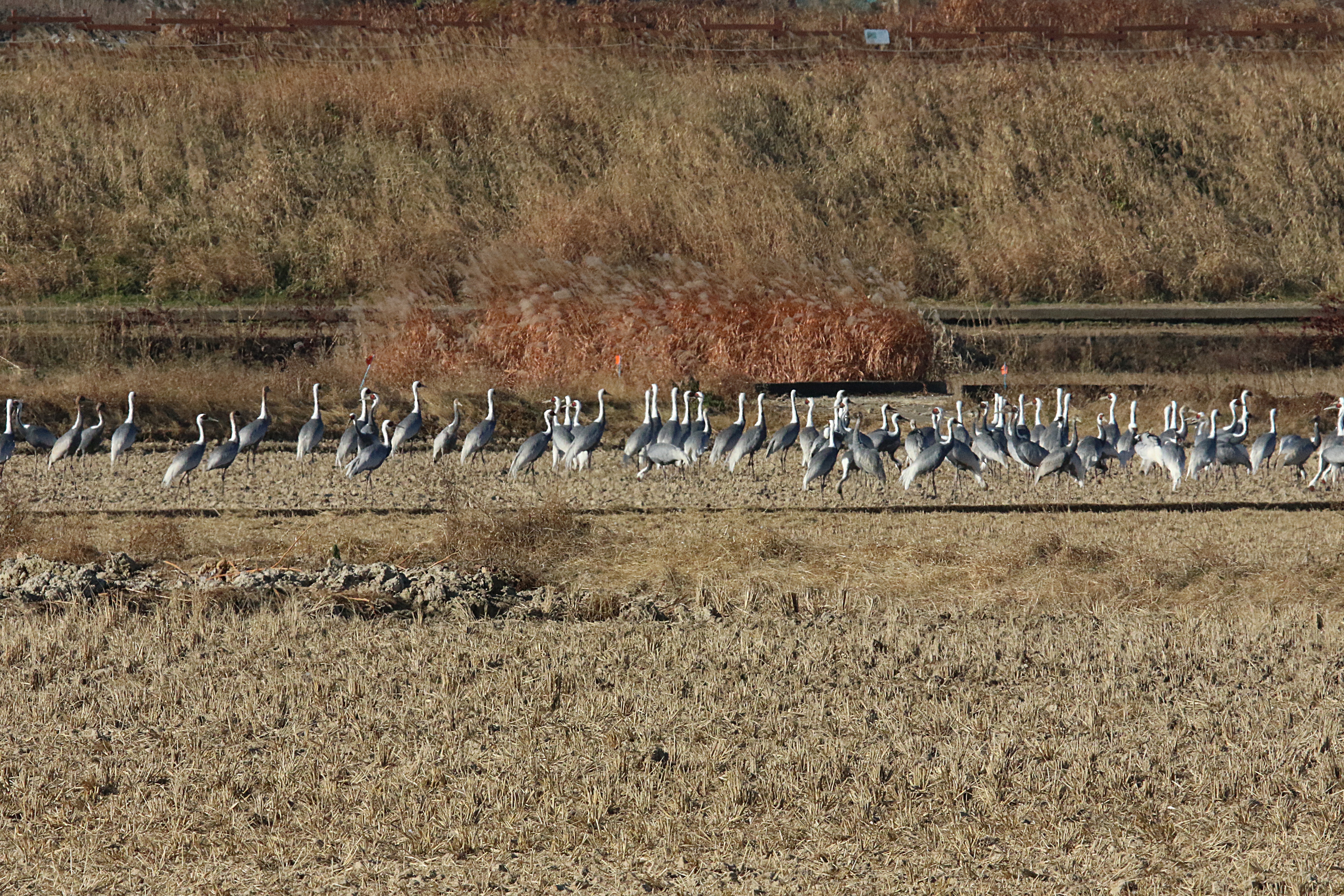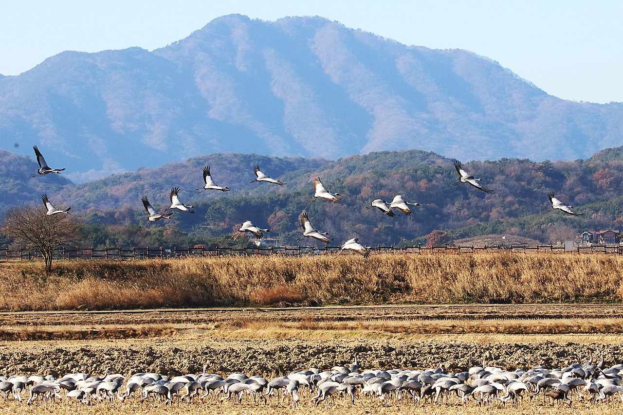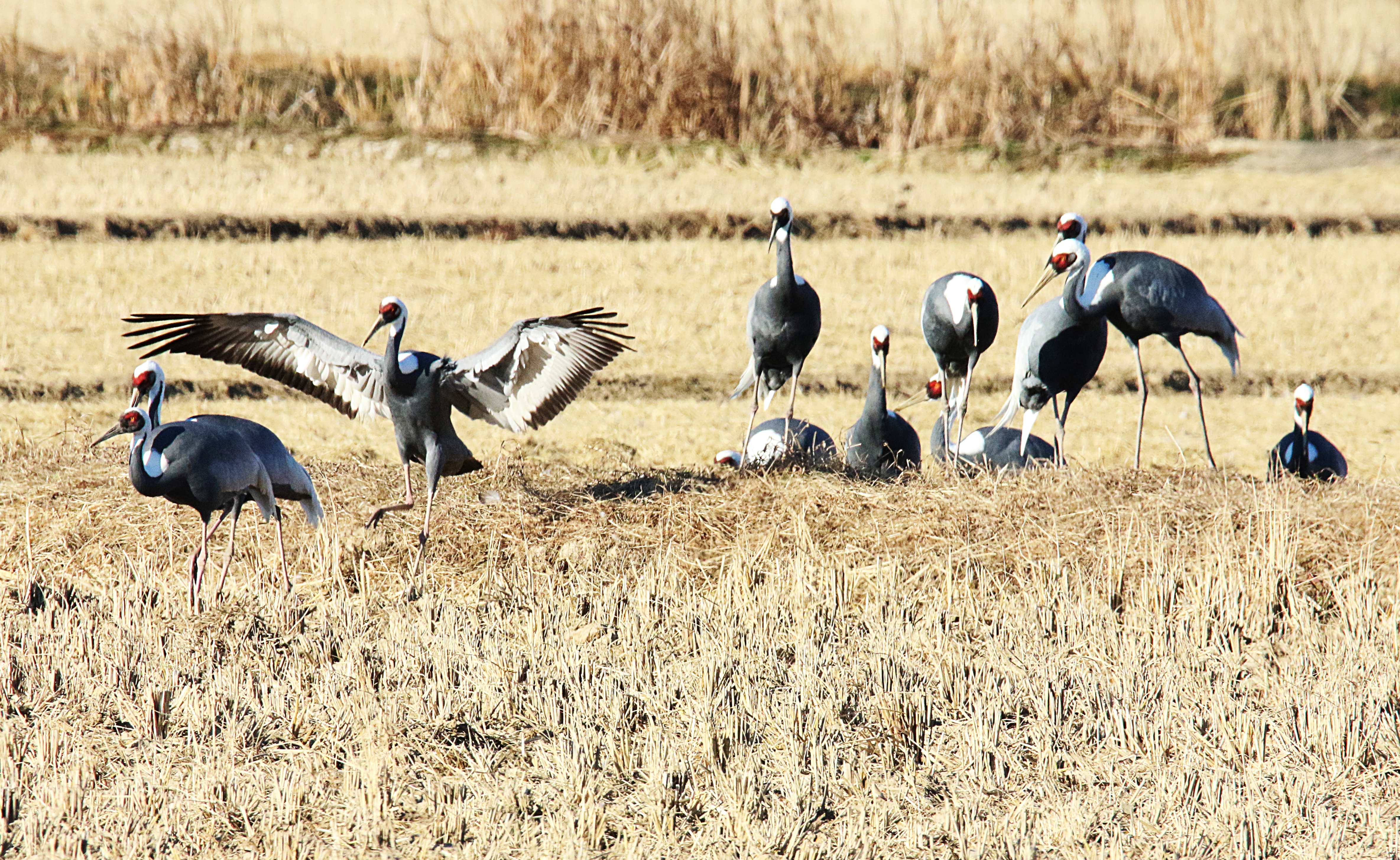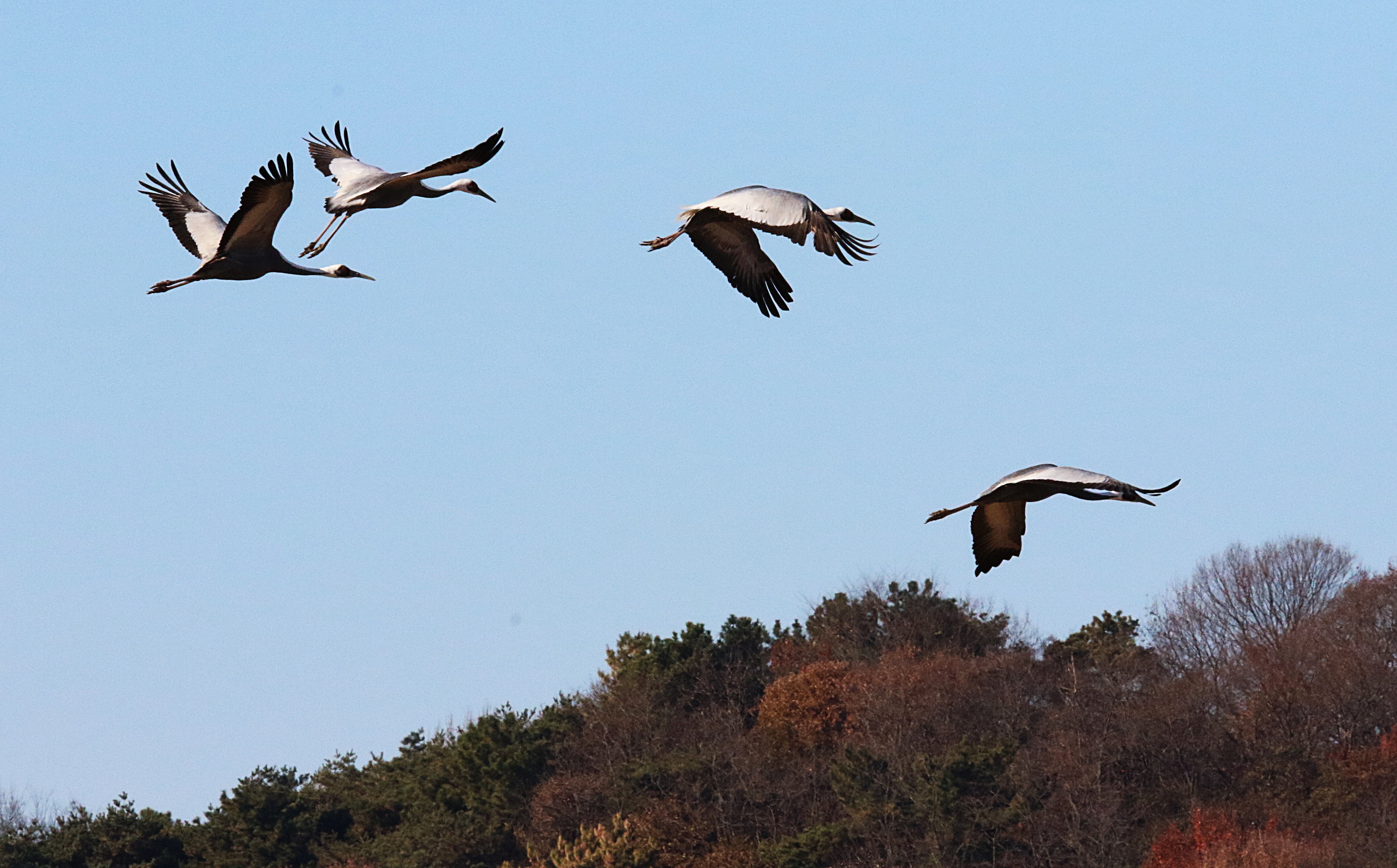 주남저수지에 겨울의 진객 재두루미가 흑두루미와 함께 돌아왔다.