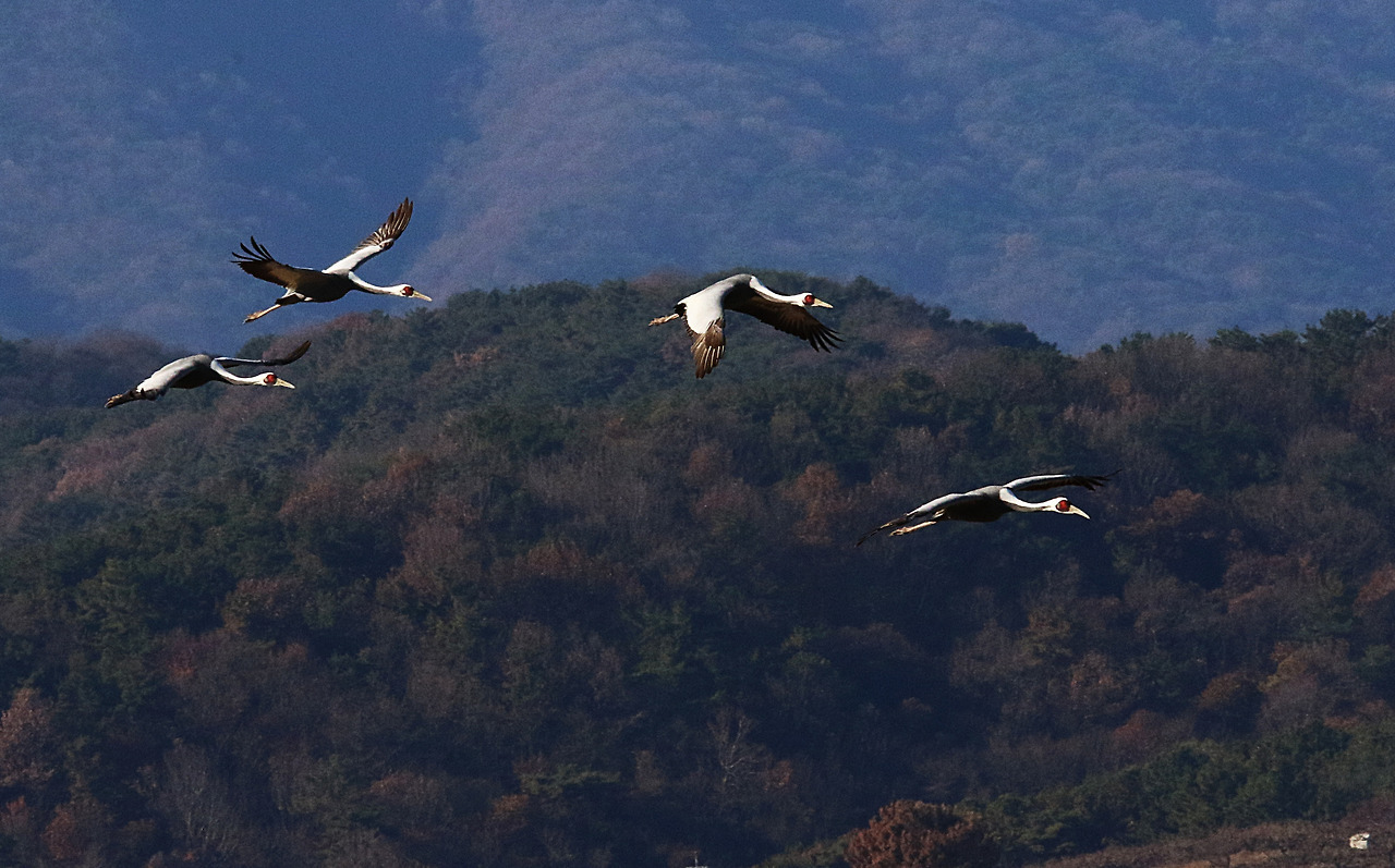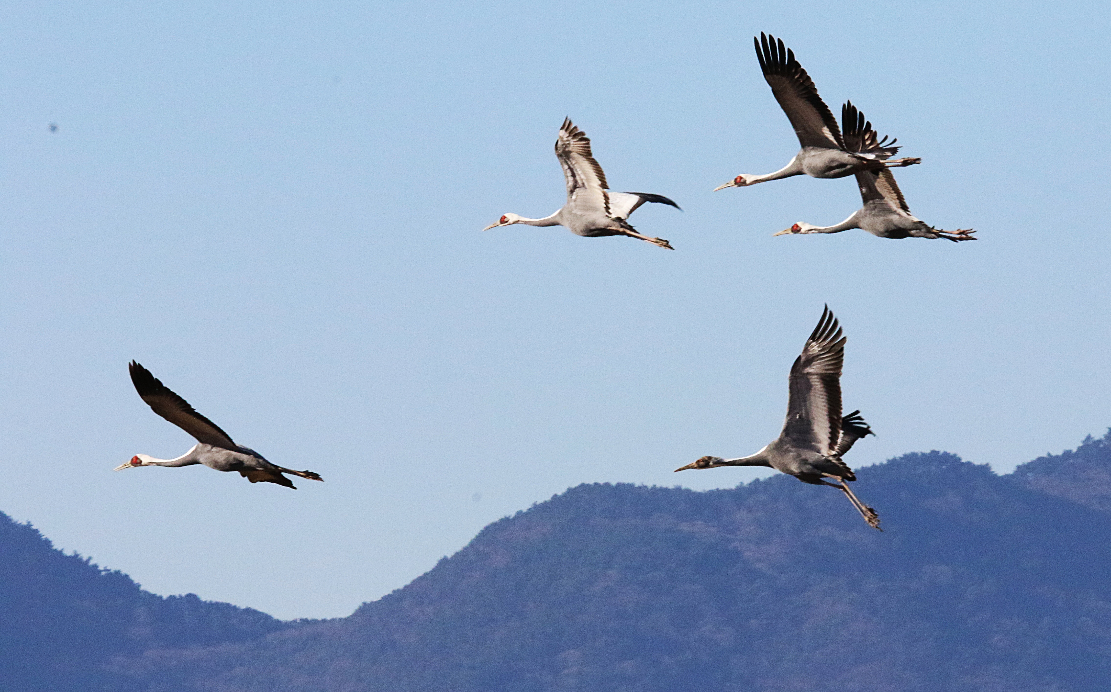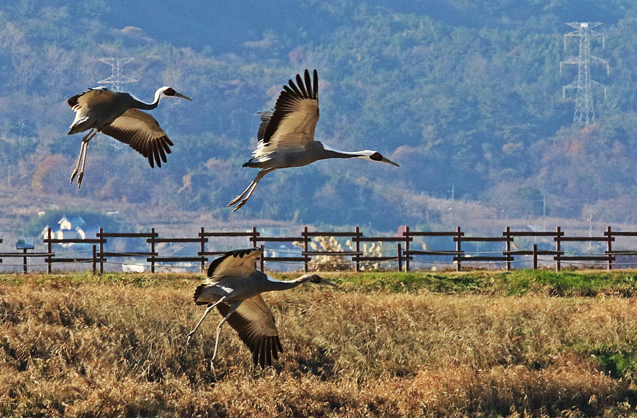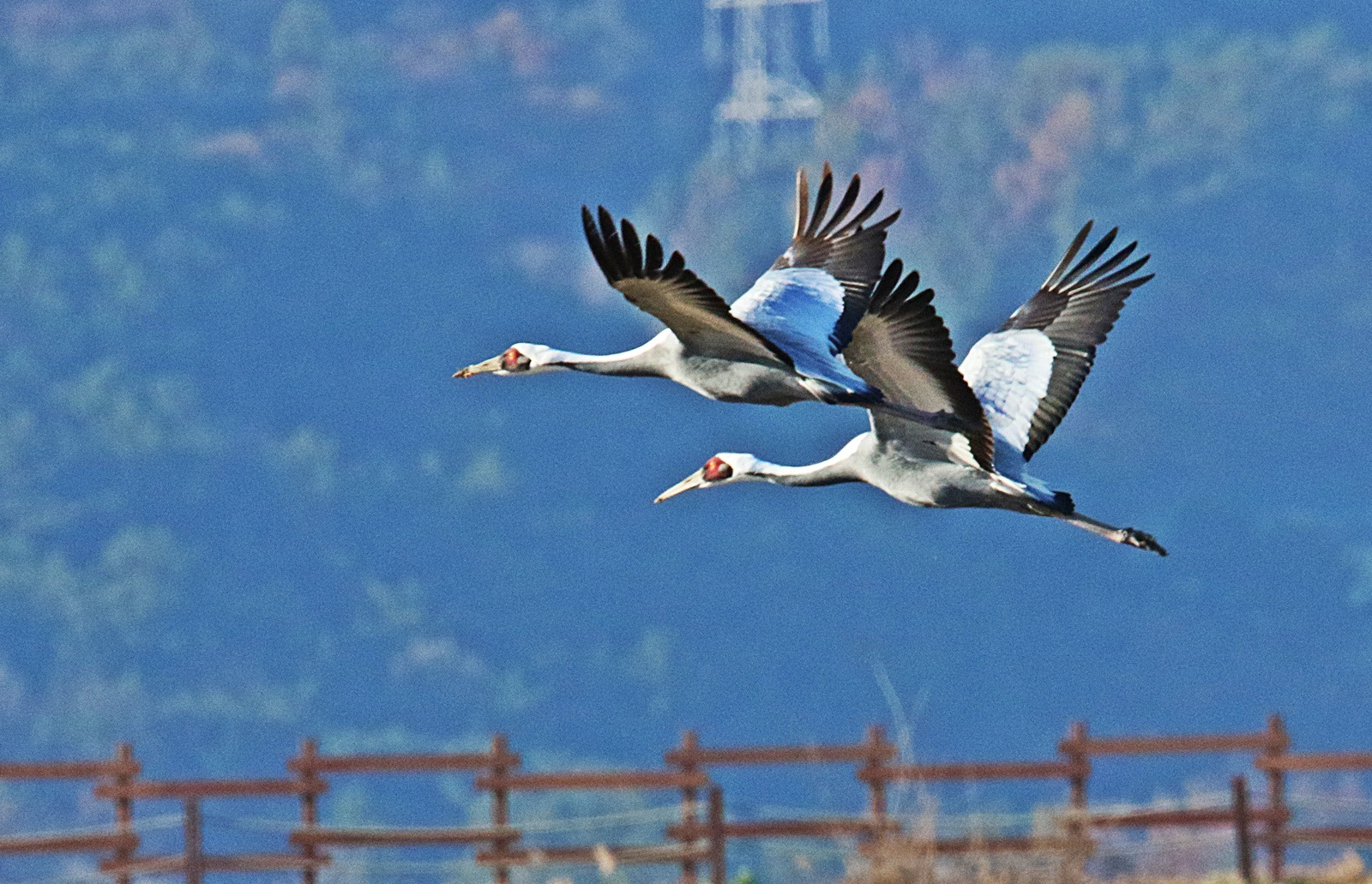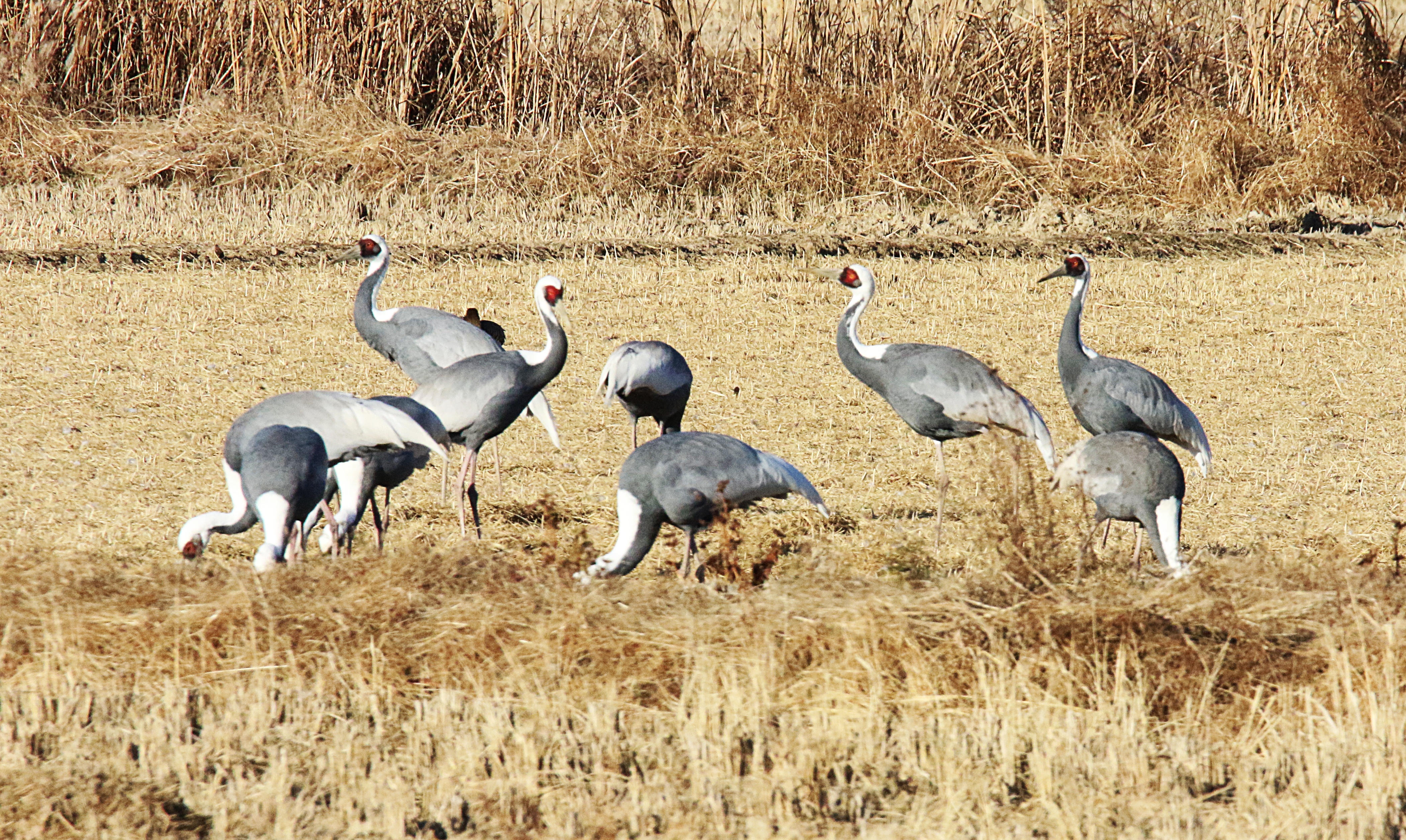 주남저수지에 겨울의 진객 재두루미가 흑두루미와 함께 돌아왔다.